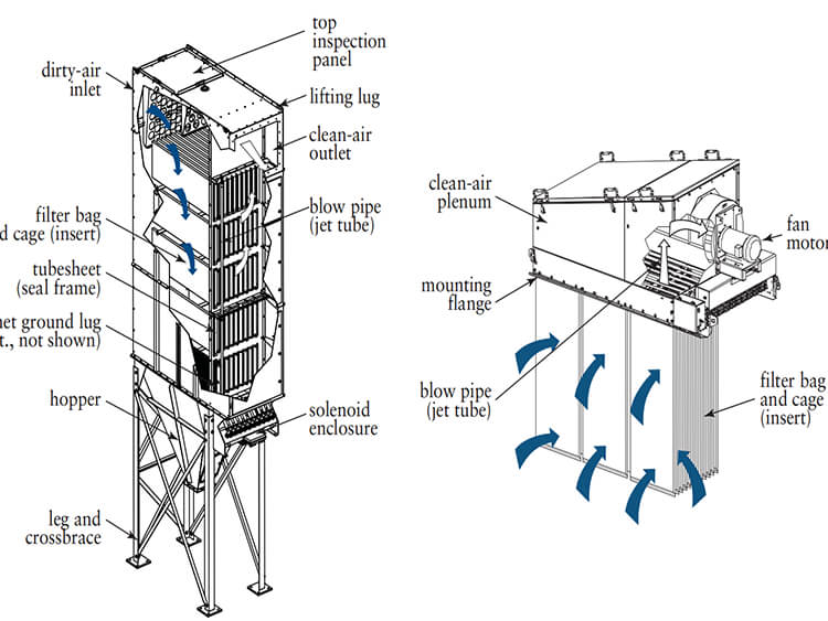 扁布袋除塵器分為DLMC模塊型與DLMV一體機(jī)型(倉頂)